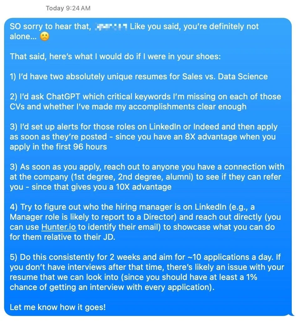 5) Do this consistently for 2 weeks and aim for ~10 applications a day. If you don’t have interviews after that time, there’s likely an issue with your resume that we can look into (since you should have at least a 1% chance of getting an interview with every application).